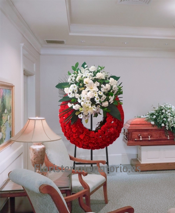 Nuestra Corona Funeraria Roja, de Floristería Tanatorio, está realizada con preciosas flores variadas en tonos rojos y blancos. Incluye un cabezal en la parte superior de la corona que está compuesta por flores para tanatorio; margaritas, lilium y clavel. Está toda ella adornada con preciosos verdes variados que le dan un toque diferente a la corona. La hermosa Corona Funeraria para tanatorio está disponible en blanco y rojo.